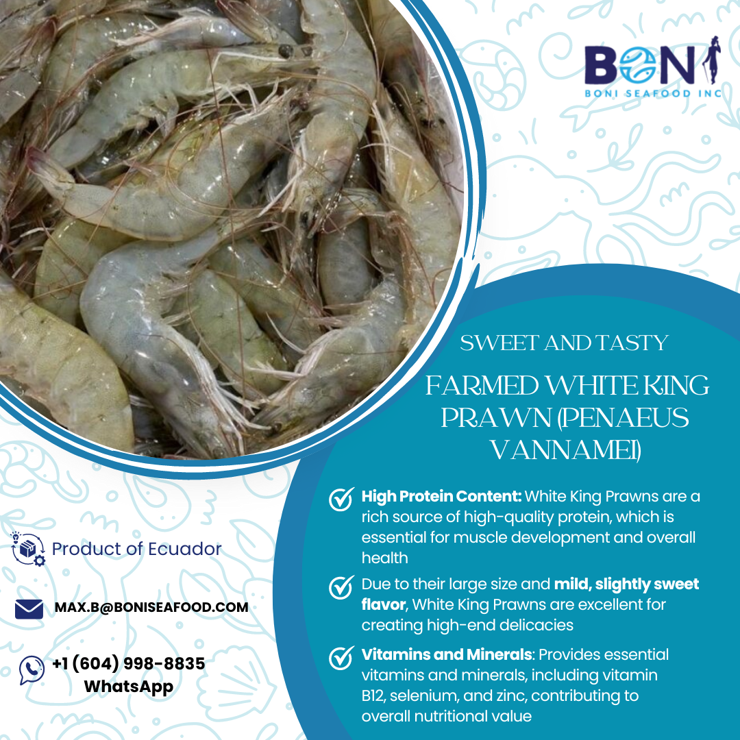 Sustainable Farming: Boni Seafood is committed to sustainable practices. Our White King Prawns are farmed in controlled environments in Ecuador, minimizing environmental impact and supporting ecological balance.